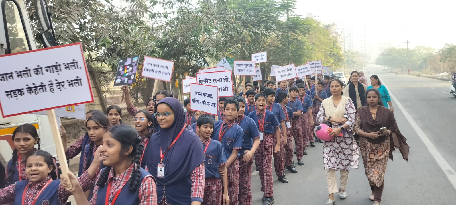 पनवेल प्रादेशिक परिवहन कार्यालयाचे वरिष्ठ लिपिक आरिफ शेख यांनी शालेय बसने प्रवास करणाऱ्या विद्यार्थ्यांना शालेय बससंबंधी नियमावलीची माहिती दिली. तसेच सायकल व पायदळ येणाऱ्या विद्यार्थ्यांना वाहतूक नियमांची माहिती देत, त्यांनी पालकांना देखील वाहतूक नियम पाळण्याचा आग्रह करण्यास सांगितले. विद्यार्थ्यांनीही सकारात्मक प्रतिसाद देत या अभियानात सहभाग घेतला. रस्ता सुरक्षा विषयावर विद्यार्थ्यांनी सादर केलेल्या गीताने सर्वांचे लक्ष वेधले. तसेच, तळोजा शहरात प्रभात फेरीद्वारे वाहतूक नियमांबाबत जनजागृती करण्यात आली. यावेळी विद्यार्थ्यांनी विविध घोषवाक्ये दिली, तसेच अपघातांच्या दुष्परिणामांवर चित्रे रेखाटून समाजात जागरूकता निर्माण केली. या उपक्रमामुळे विद्यार्थ्यांमध्ये वाहतूक नियमांबद्दल जागरूकता निर्माण झाली असून, त्यांनी आपल्या पालकांना नियमांचे पालन करण्यासाठी प्रेरित करण्याचा निर्धार केला आहे.